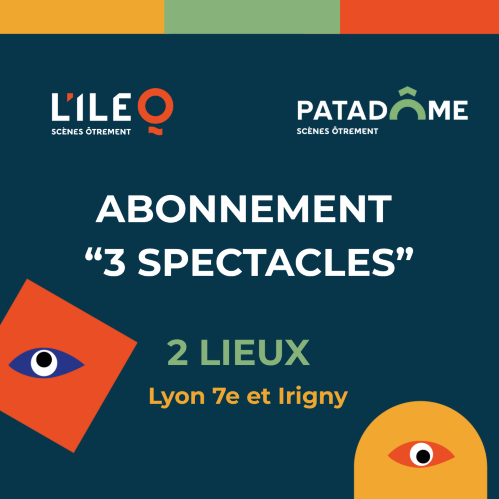 Pour votre abonnement, vous pouvez choisir des spectacles dans nos deux lieux : Théâtre L'Île Ô (Lyon) et Patadôme Théâtre (Irigny – 15 min de Lyon). Votre abonnement vous permet de continuer à profiter du tarif abonné.e tout au long de la saison. Dès confirmation de votre commande, vous recevrez un code abonné.e à renseigner lors de vos prochaines commandes sur notre billetterie en ligne, ou sur place au guichet.